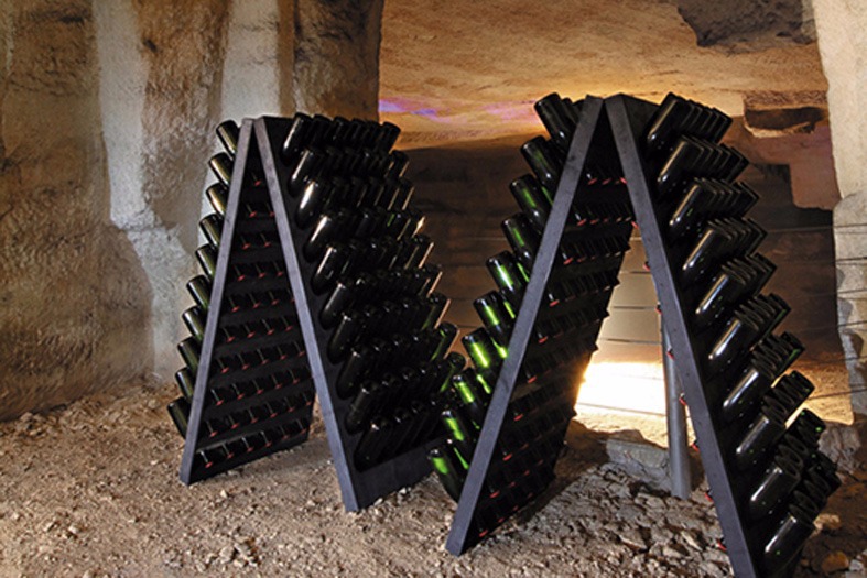 Remuage. Messa in punta,dopo un periodo di lento e tranquillo riposo di almeno tre anni nelle nostre grotte avviene la fase della messa in punta: le bottiglie sono disposte su appositi cavalletti (pupitre) che tengono il collo più in basso rispetto al fondo della bottiglia; la continua rotazione della stessa fa depositare i residui della fermentazione (lieviti esausti), sul tappo.